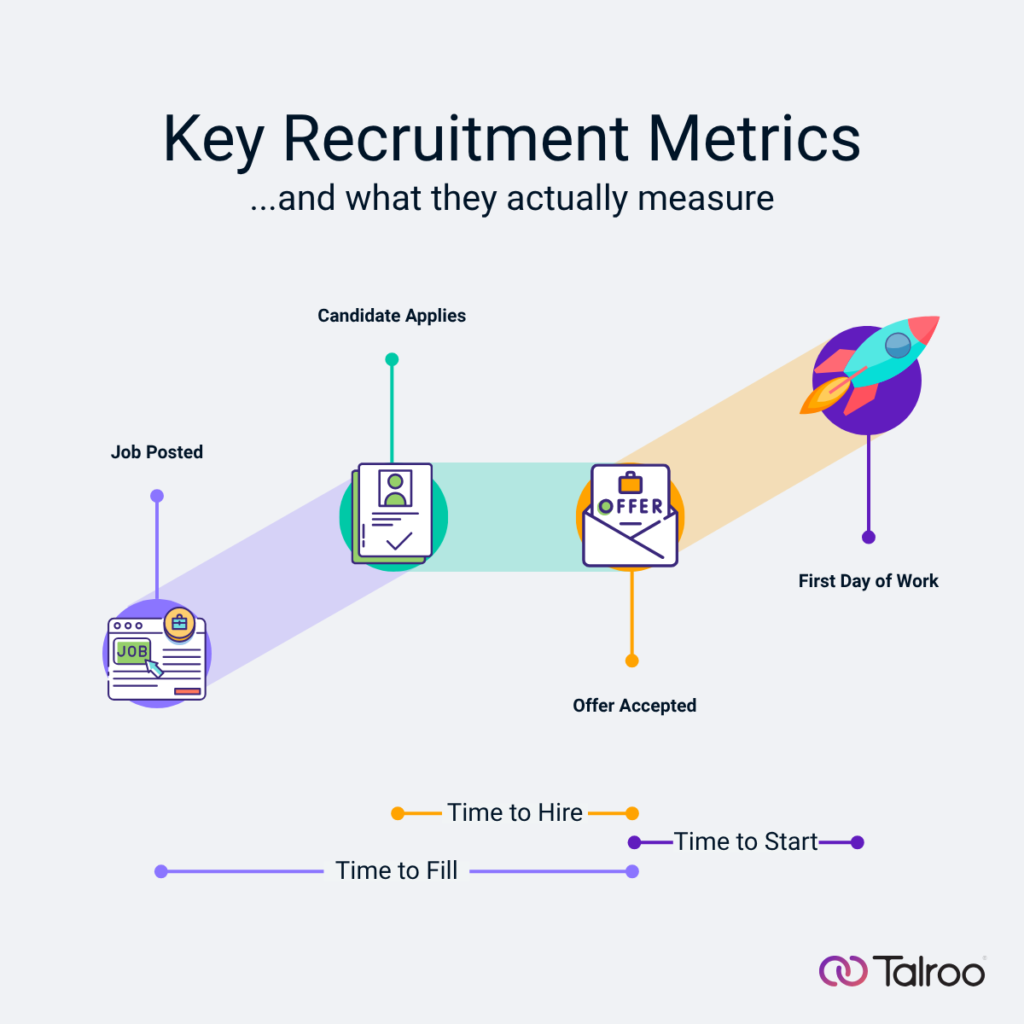 - Time to Start takes over after acceptance, measuring how long it takes for the candidate to officially join.