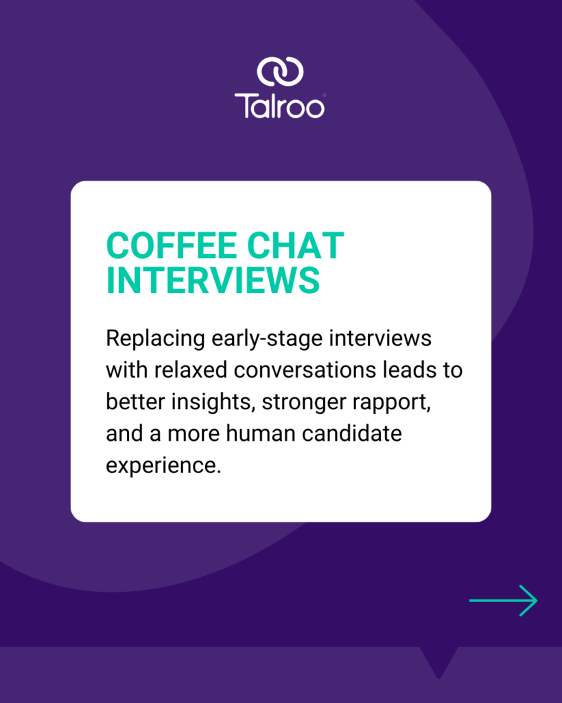 Real-world scenario: A recruiter invites top applicants to “coffee chats” where the candidate steers the discussion. Rather than strict questioning, it becomes a conversation about goals, motivations, and culture fit. This gives recruiters richer insight earlier in the process.