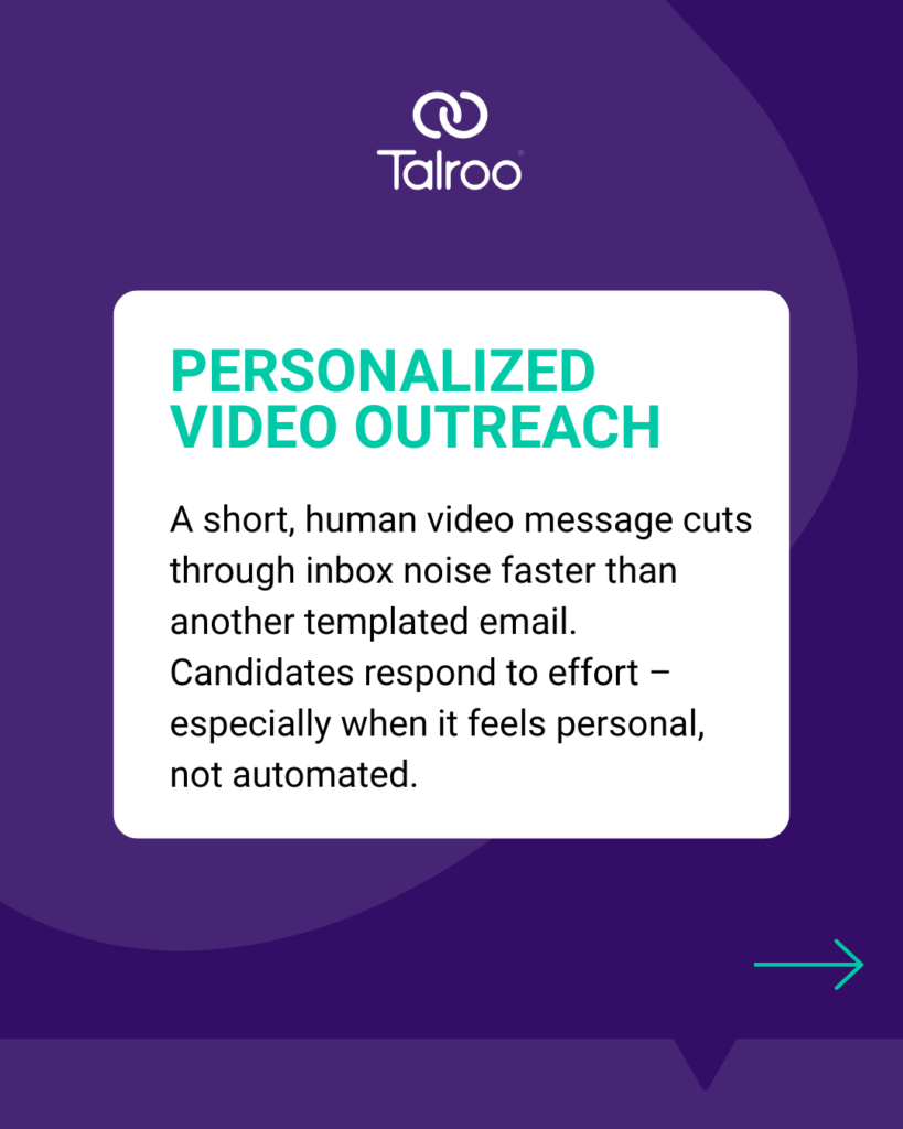 Why this is outside the box: Most recruiters still rely on templated emails or generic InMails. Sending a custom video message flips the script. It shows real effort and helps build connections before a single interview occurs.