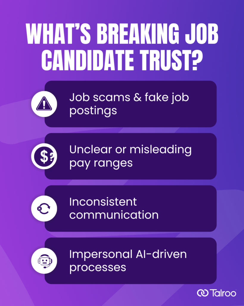 Today’s job seekers face a perfect storm of uncertainty. Several factors have accelerated this trust recession and reshaped candidate expectations.
