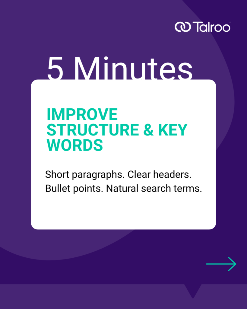 Additionally, include relevant keywords naturally to improve visibility in job board searches and search engines. For frontline roles, this may include specific job titles, skills, and industry terms that candidates are likely to use when searching.
