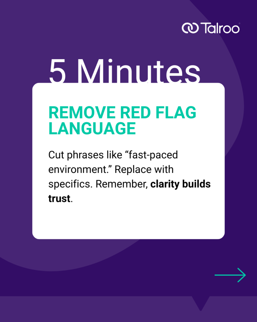 Certain phrases can inadvertently reduce candidate interest. Generic descriptors such as “fast-paced environment” or internal jargon may confuse or deter applicants.